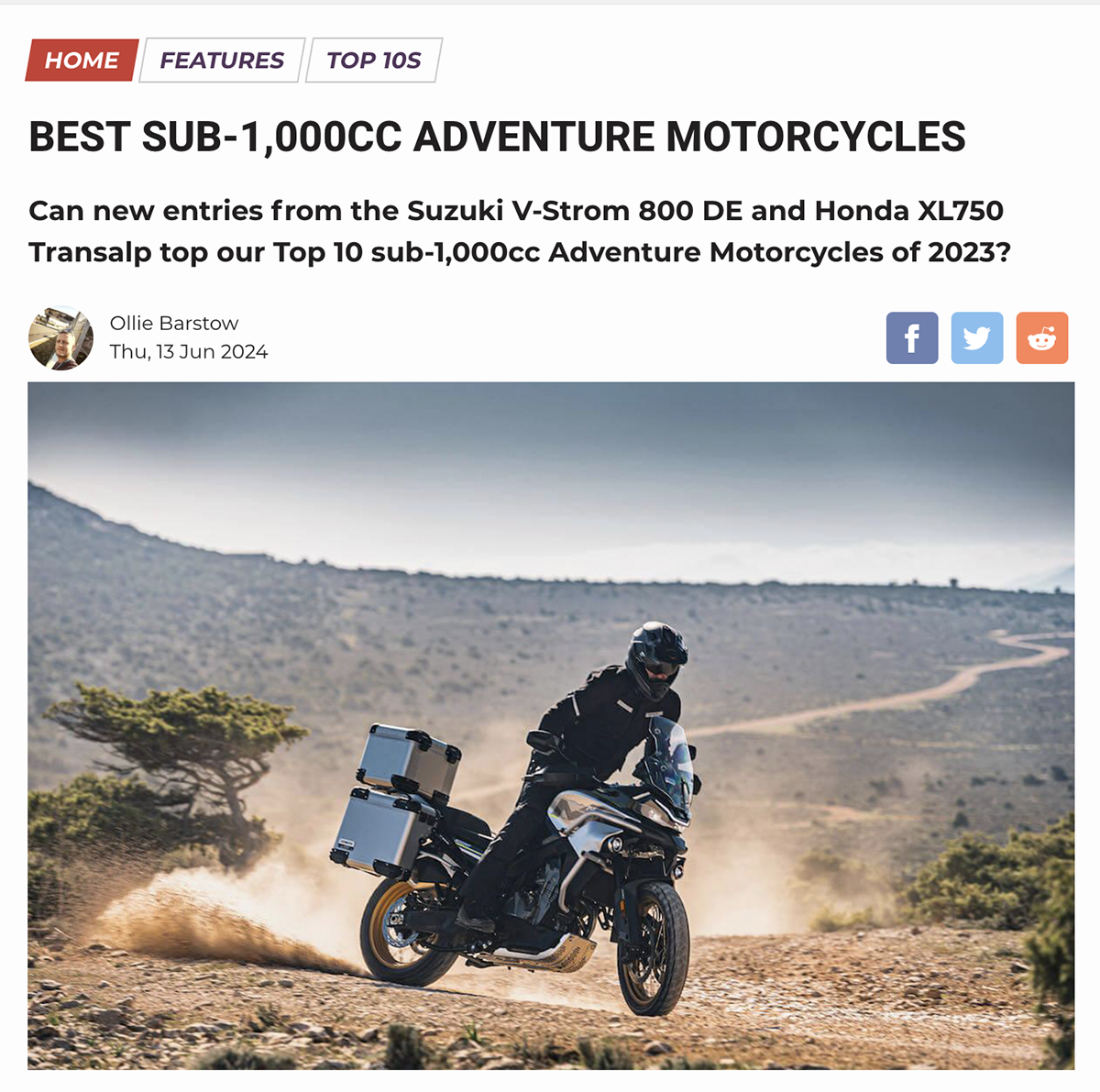 Renomirani magazin Visordown.com je objavio svoju listu TOP 10 ADV motocikala ispod 1000cc, a među najboljima se našao i naš model CFMOTO 800MT. Ovo priznanje dolazi kao rezultat napornog rada i inovacija koje je CFMOTO uložio u razvoj svojih motocikala.