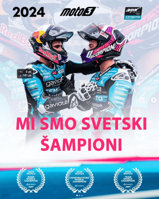 CFMOTO je ponovo pomerio granice i ispisao novu stranicu u istoriji MotoGp-a! Naša strast za nadmetanjem, posvećenost izvrsnosti i neumorna težnja ka ostvarenju snova kulminirali su fantastičnim uspehom u Moto3 klasi svetskog MotoGP šampionata. Ova sezona je za CFMOTO Aspar Racing Team i sve njegove fanove nezaboravna – završili smo je s trostrukom titulom, potvrdivši dominaciju u čak tri ključne kategorije.